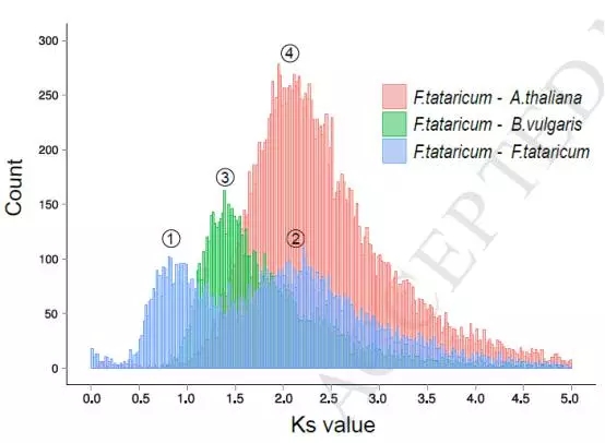 通過苦蕎與擬南芥、苦蕎與甜菜進行分析,通過Ks計算發現苦蕎經歷了全基因組復制事件,近期是在下圖0.84-0.92之間,而更古老的一次復制發現在64.42~70.77 Mya。而全基因組復制事件的發生,也導致了很多與抗逆相關基因家族的擴張或者保留。這也與后期苦蕎的抗逆性有一定關系。