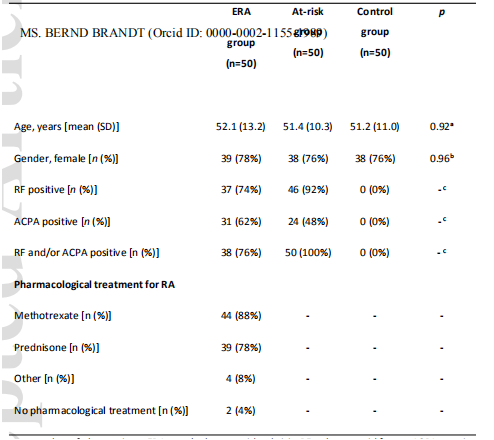 從2017年11月到2019年7月共納入了150名參與者,每組50人(表1)。ERA患者平均在確診為RNA后3.1±1.7個月入選。大部分ERA患者按照國家類風濕關節炎藥物治療指南采用甲氨蝶呤治療,多與強的松聯合治療(表1)。