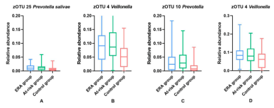 總結:結果顯示ERA患者和高危個體之間的口腔微生物組有相似之處,與健康對照組相比,均表現出潛在促炎物種相對豐度的增加,這表明口腔微生物組和RA發病之間可能存在關聯。