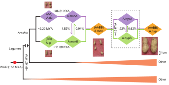 充分注釋了高質量野生四倍體花生基因組,揭示了花生亞基因組單系起源和遺傳進化模型,表明了野生和栽培四倍體花生亞基因組發生了不對稱進化;此外,野生花生中存在的獨特等位基因可以改善栽培花生的抗性和莢果大小等形狀,為研究多倍體基因組進化、作物馴化和基因組輔助花生生產改良提供獨特的價值。